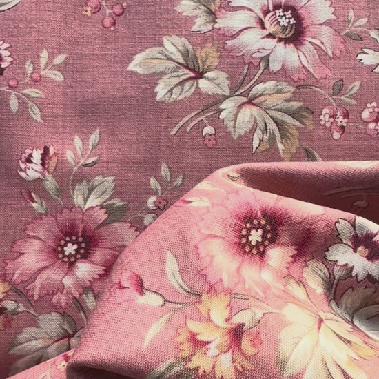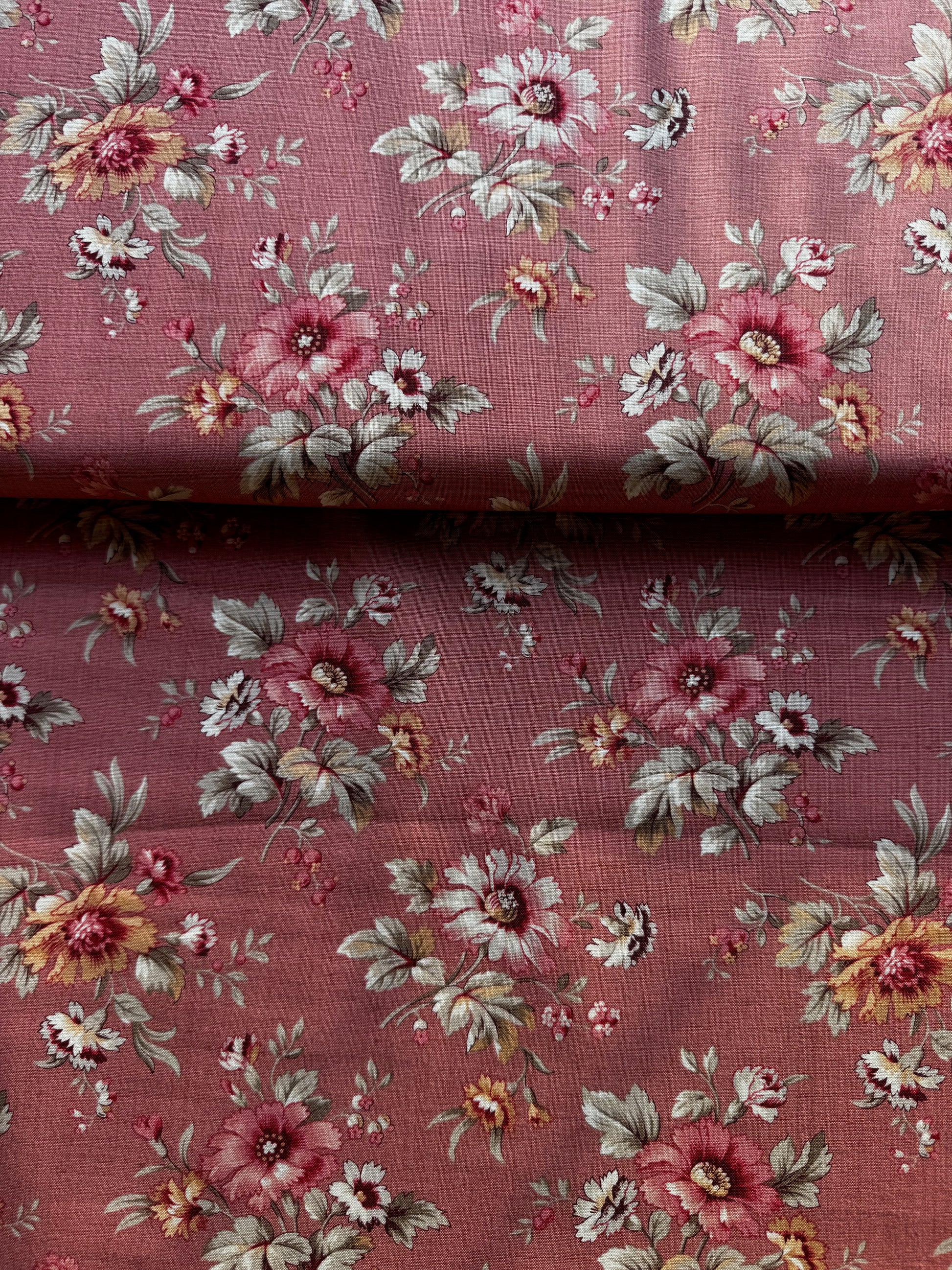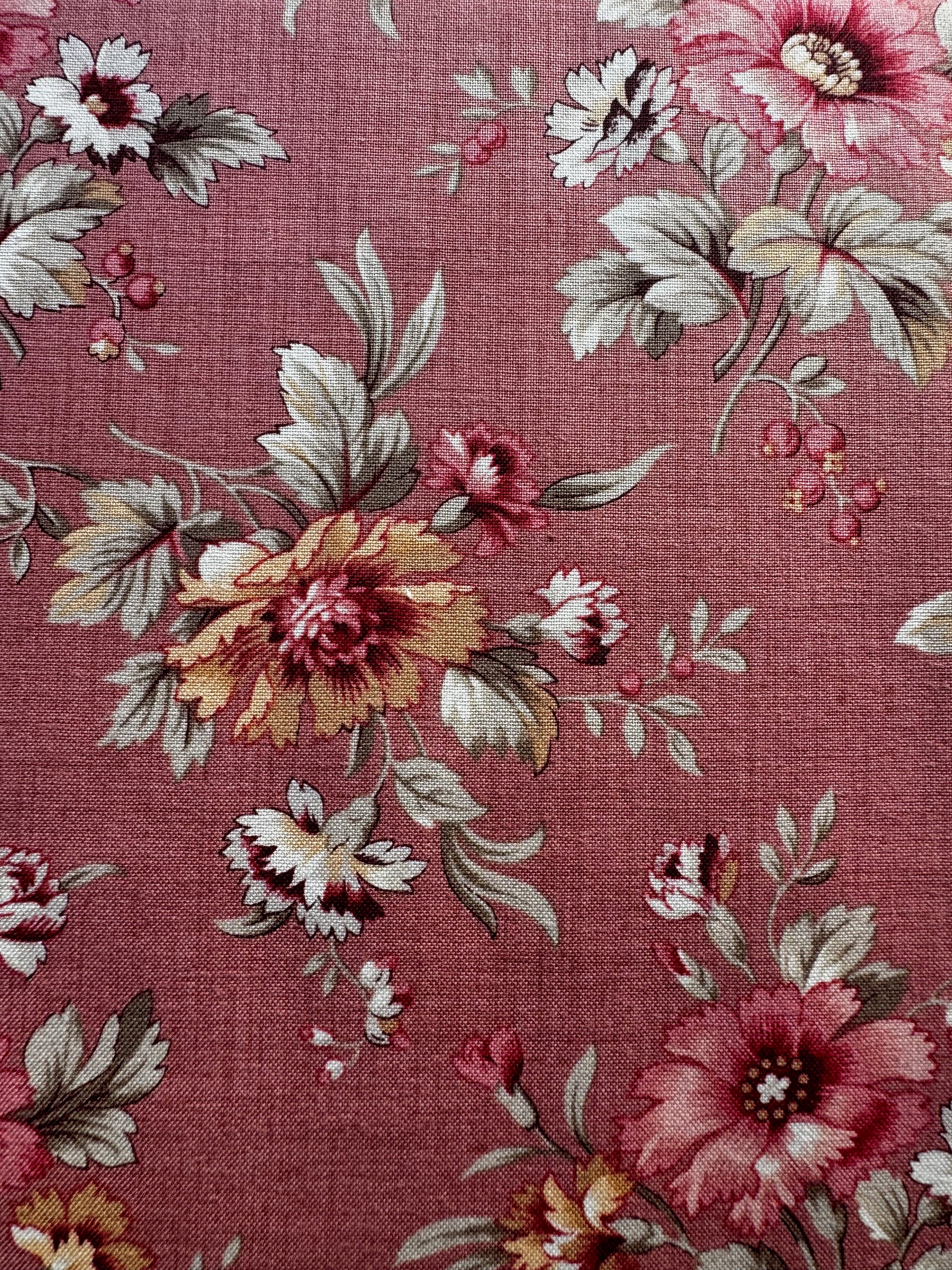 🧵What a simply gorgeous fabric from French General for Moda for the Joie De Vivre collection. Large Floral Clay shows a beautiful pattern of large scale soft red and cream flowers intertwining on stems and leaves on a soft clay taupe background.
